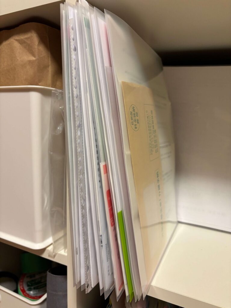 『必要な書類は立てて保管する』こと、そして、『必要でない書類は、ケースに入れて溜めておき、定期的に処分する』ことをオススメします。